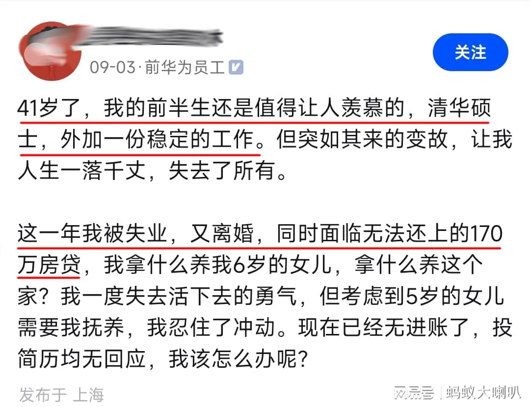 一位华为前员工发帖称自己中年失业又离异,我该拿什么养家?