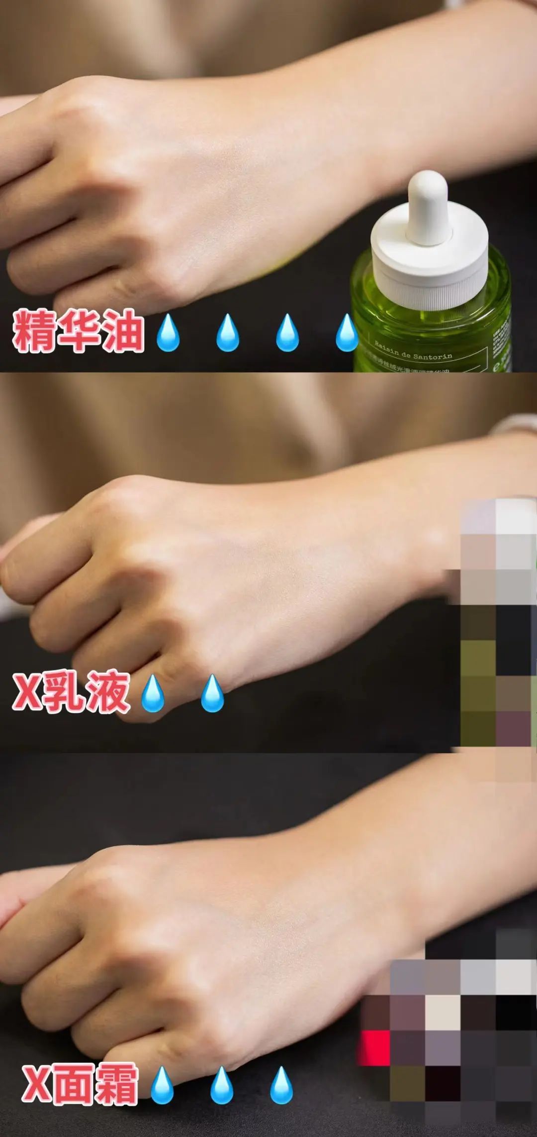 为了测试它的水感,我选择了面霜和乳液做了对比。