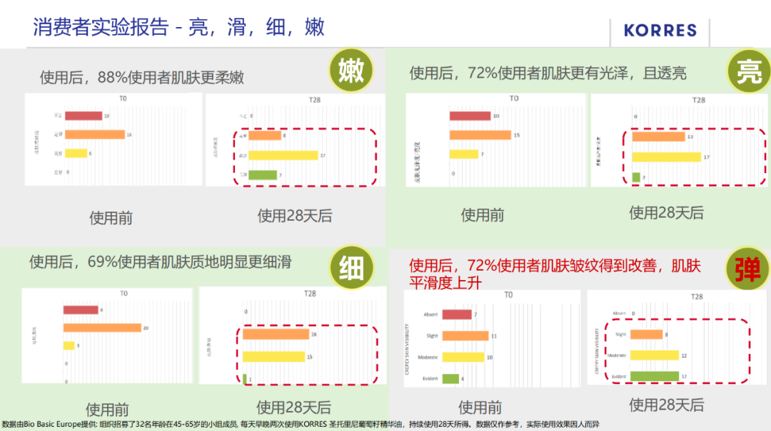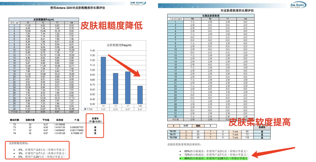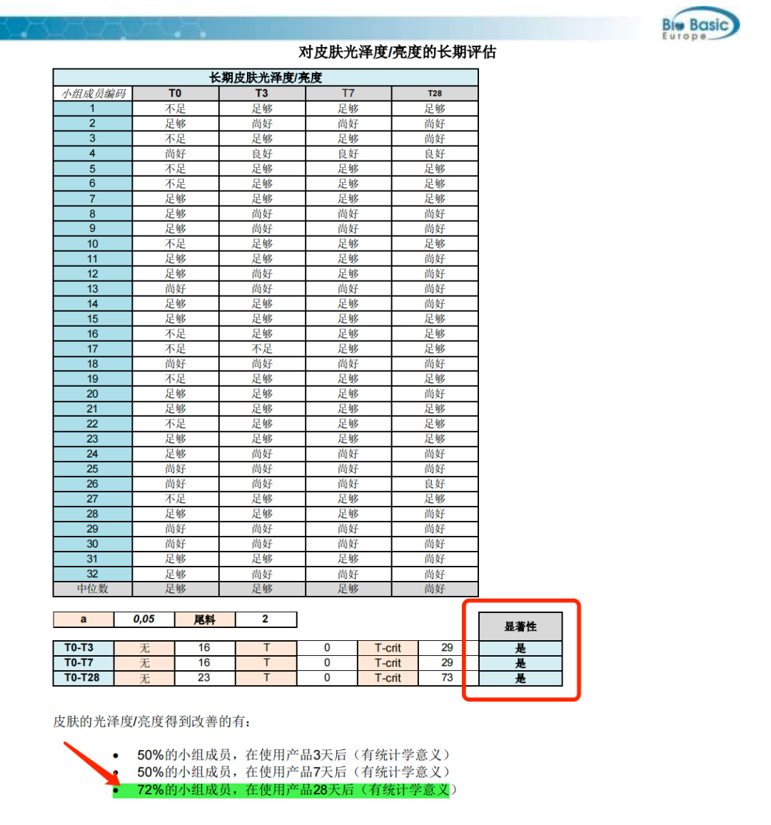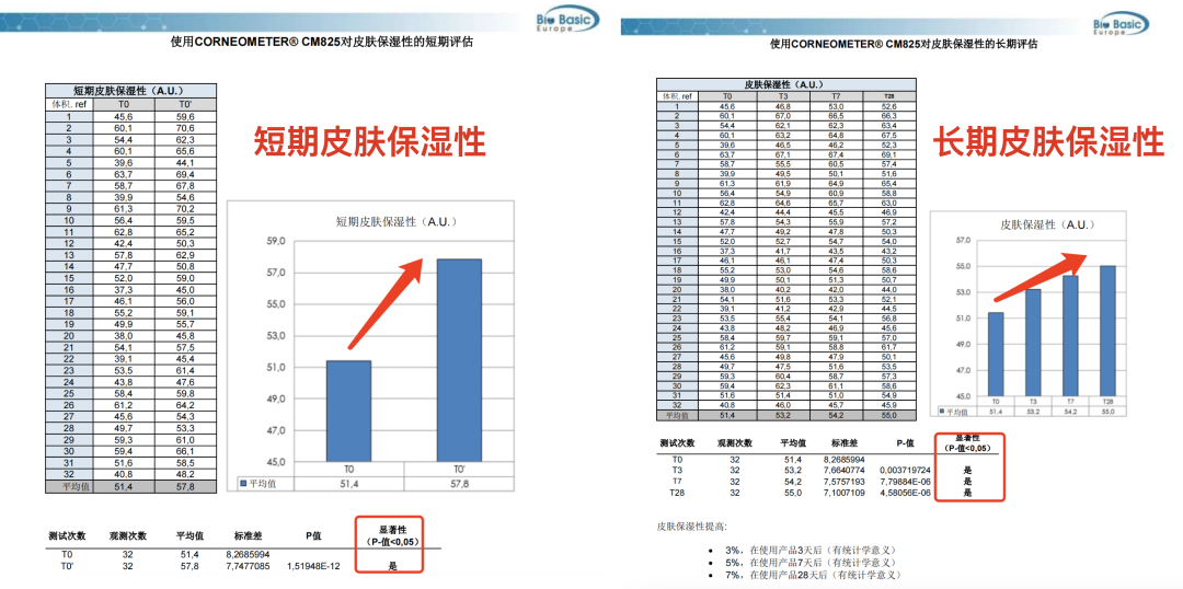 无论是短期的皮肤保湿效果增长还是28天长期的皮肤保湿性,都有显著的效果。