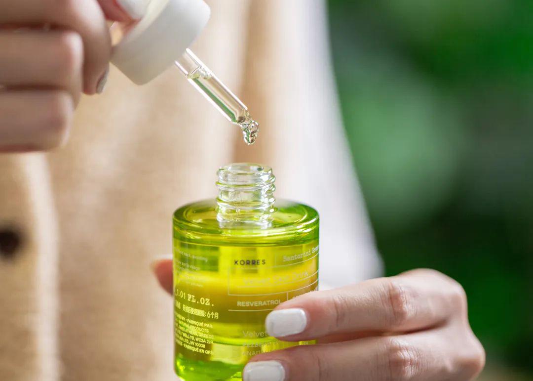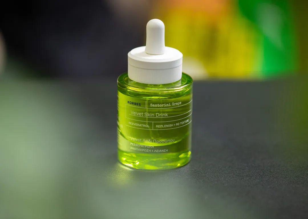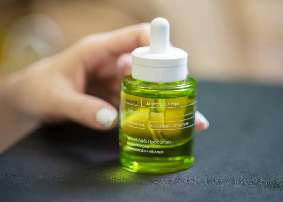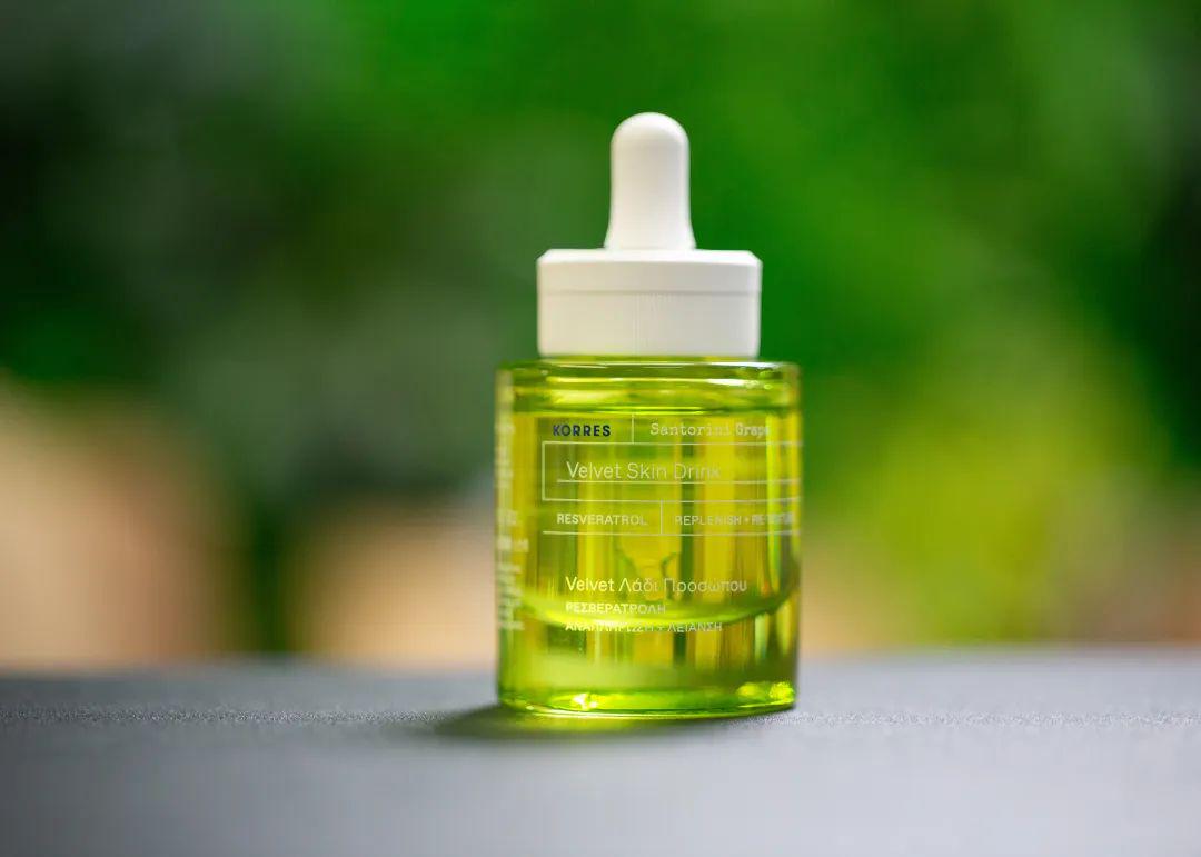 KORRES珂诺诗丝绒光滑调理精华油的葡萄提取物,萃取自圣托里尼的老藤葡萄,富含高倍葡萄多酚,多酚也是各大厂爱用的抗氧化剂。