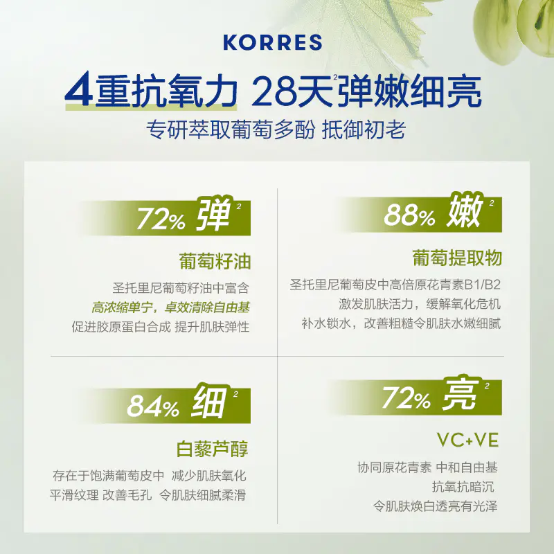 葡萄籽油、葡萄提取物、白藜芦醇、VC VE, 4重抗氧组合打通多链路,实现弹嫩细亮。
