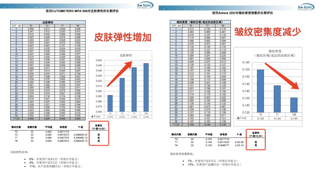 在应对“皱纹”“弹性”两方面,实验数据也佐证了不俗的效果。