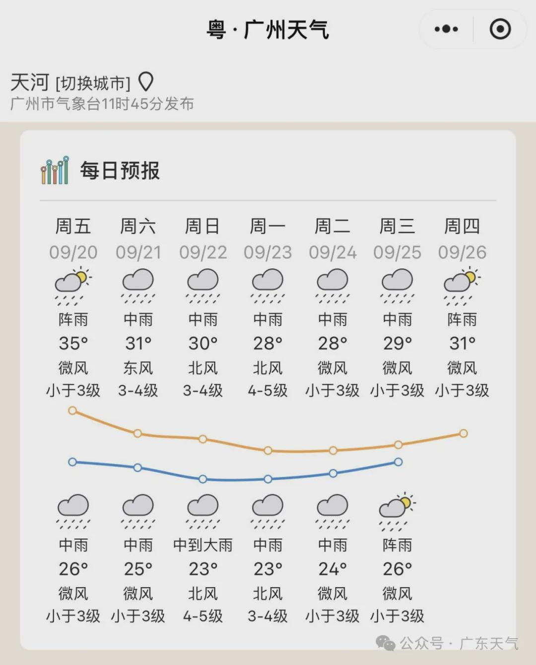 届时,高温炎热退场,广州23-24日的最高气温降至28℃。