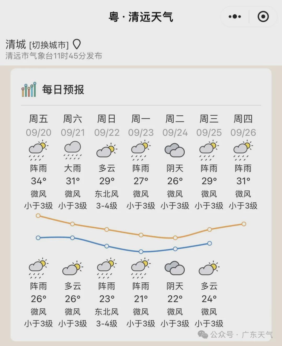 粤北体感会更加明显一些,像清远23-24日最高气温降至26-27℃,最低21-22℃,早晚略显清凉,体弱人群需要注意适时添衣。