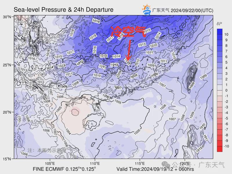 所以未来几天,雨在“涨”(越来越频繁、越来越明显),而气温在“跌”!22-24日,受冷空气和降雨影响,我省的平均气温自北向南将会下降4-6℃。对,没有看错,是冷空气!还是广东今年下半年首场冷空气!
