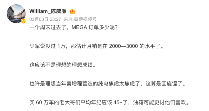 实际的情况就是,理想MEGA上市时间是3月1日周五下午,卡在我们即将下班的时间点,打工人心里想的是——别TM瞎折腾。