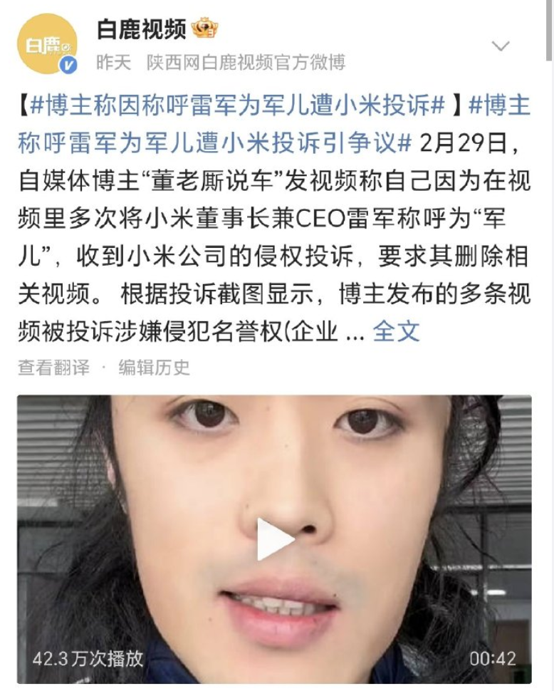 当然,车圈中李想并非个例,近期有某博主称呼雷军为“军儿”,收到小米公司的侵权投诉,要求其删除相关视频。该事件仍在网络上发酵,引发网友们探讨,有人认为该博主缺乏对雷军的尊重,冷嘲热讽有贬低的嫌疑。