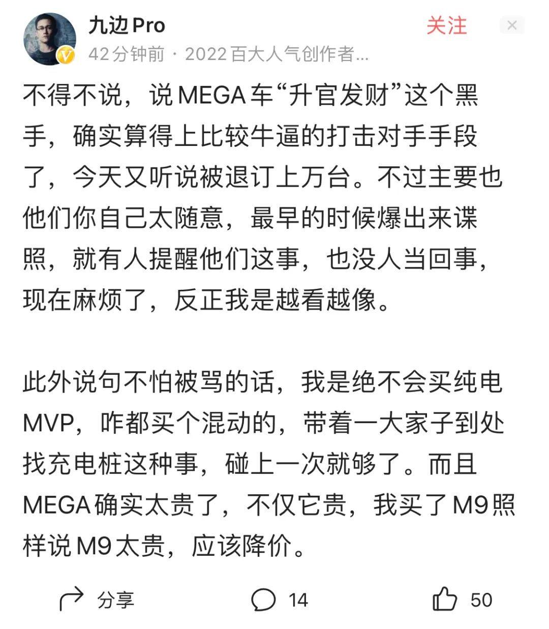 毕竟全网诸多著名KOL、大V的测评视频倾巢而出,理想MEGA不缺我们一家点评“拱火”,我们有自知之明,自认为在全网瓜分不了多少流量,积攒不了多少粉,想着倒不如“摆烂”。