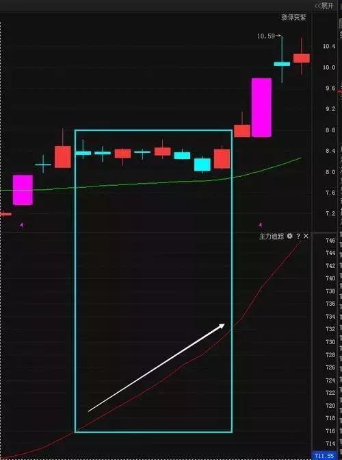 3、股价在回档过程中主力追踪依然保持45度角斜率向上倾斜(主力追踪代表量的趋势,若形成了较大的向上倾斜斜率则说明主力资金增仓趋势明确)。