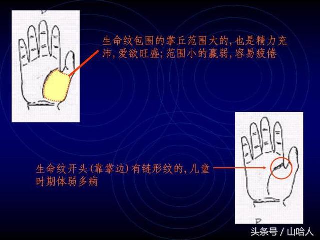 生命纹包围的掌丘范围大的,也是精力充沛,爱欲旺盛;范围小的嬴弱,容易疲倦