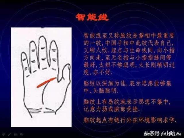 智能线至又称脑纹是掌相中最重要的一纹,中国手相中此纹代表自己,又称人纹.起点与生命线同,向小指方向走,至无名指与小指指缝间停最好,太短不够聪明,太长则精明过度,亦不好.