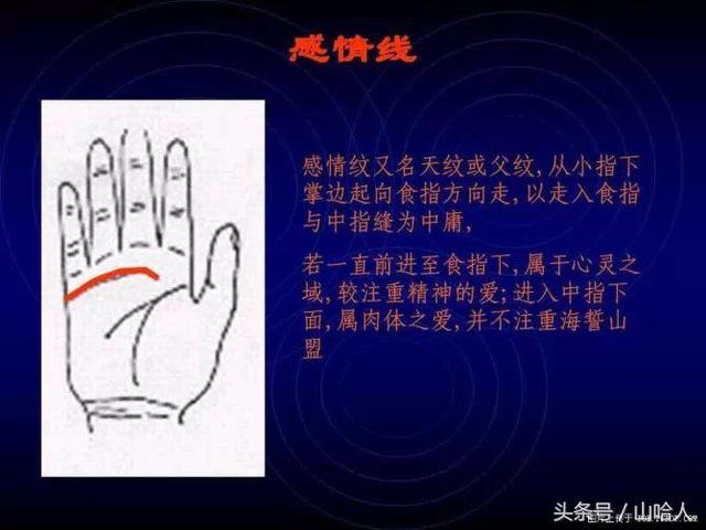 感情纹又名天纹或父纹,从小指下掌边起向食指方向走,以走入食指与中指缝为中庸,