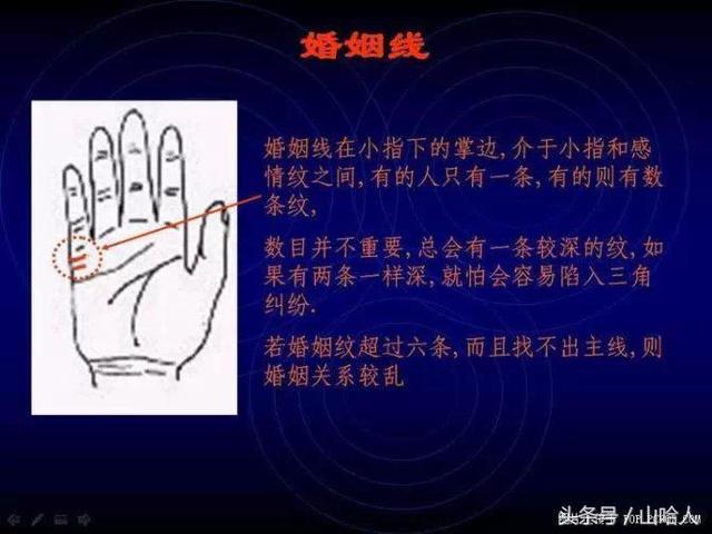 若婚姻纹超过六条,而且找不出主线,则婚姻关系较乱婚姻纹长,择偶条件苛,对配偶的要求也高,婚姻上会有压力.