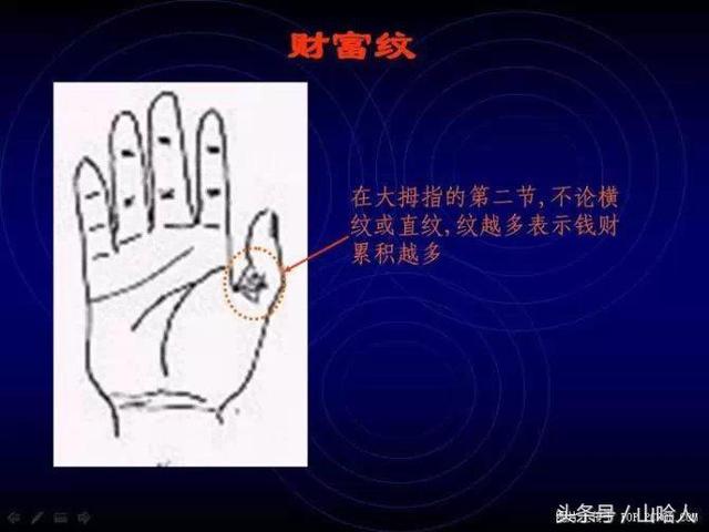 在大拇指的第二节,不论横纹或直纹,纹越多表示钱财累积越多