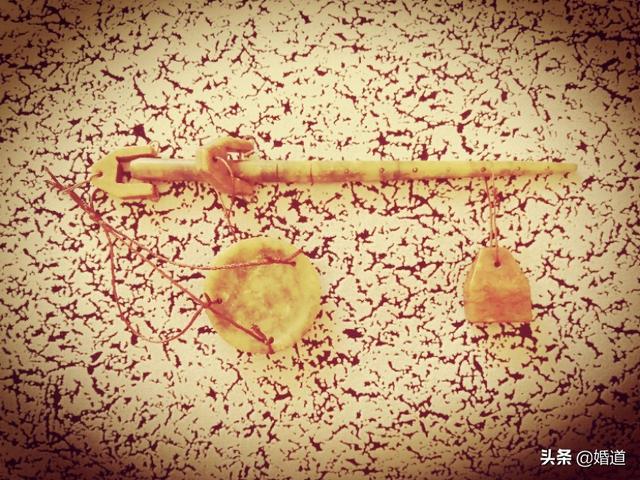 四、秤:称重之物,取杆弃砣,置于案几,即此秤能知轻重,却绝不分斤两。谕示新人,结婚之人遇事须分得出轻重,但绝对不能斤斤计较。二则,秤杆下有秤钩即:钩子。钩子勾子,意为新人钩来子子孙孙。三则,众所周知秤杆是传统婚礼中,新郎为新娘挑盖头的专用道具。为什么唯独称杆能承此大任呢?最大众化的解释就是,讨秤心如意的口彩。但是还有另外一种说法,观秤杆之形,直杆硬长,双耳悬钩,形似男性生殖器。新郎握秤钩一端,伸长杆入新娘头顶盖头正中,为新娘挑盖头,其意就不用我解释了吧?