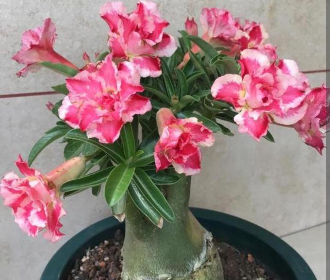 沙漠玫瑰从它的名字上就知道,这是一种原产于干旱的沙漠植物,但是它跟玫瑰是不沾边的,只不过开花也是非常的漂亮。养护好了一年能多次去开花。