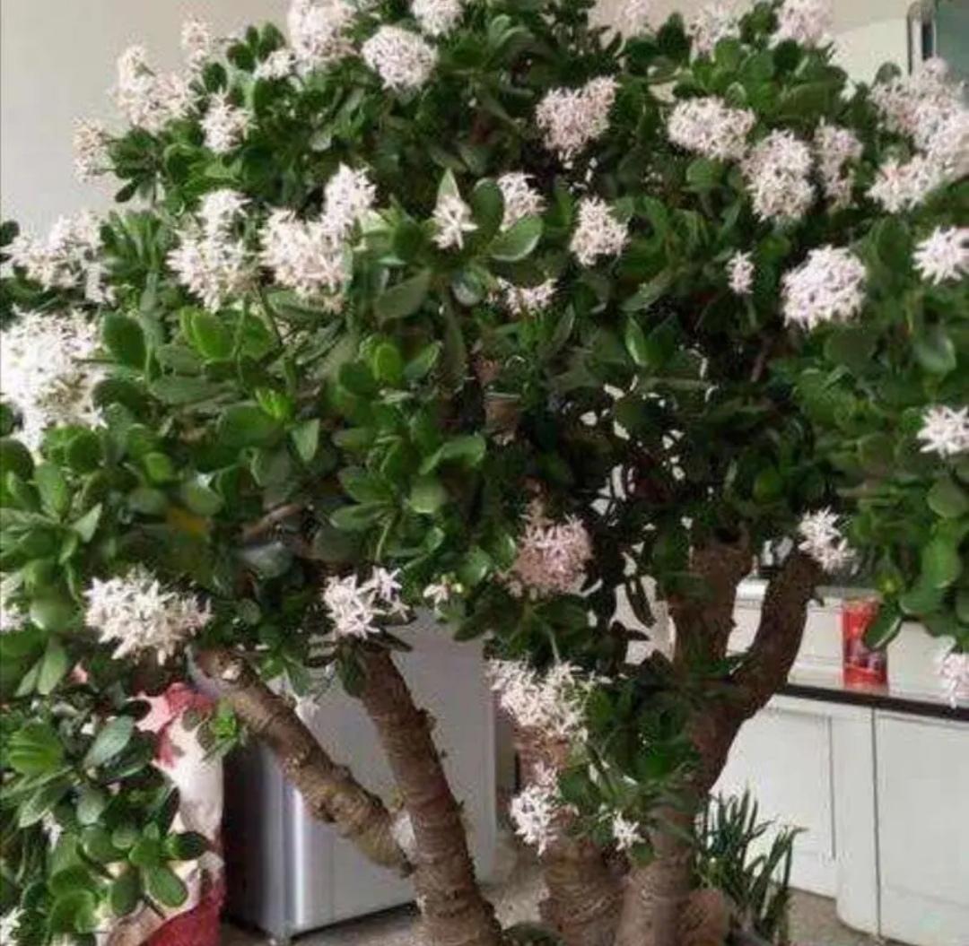 玉树是景天科多浆植物,它的枝干古朴,叶片翠绿,能开白色或粉丝小花。它的生命力顽强,有的玉树能养几十年,成为苍劲古朴的老桩盆景,开出满树繁花,更寓意着好运要来,养在家里非常的喜庆吉利。