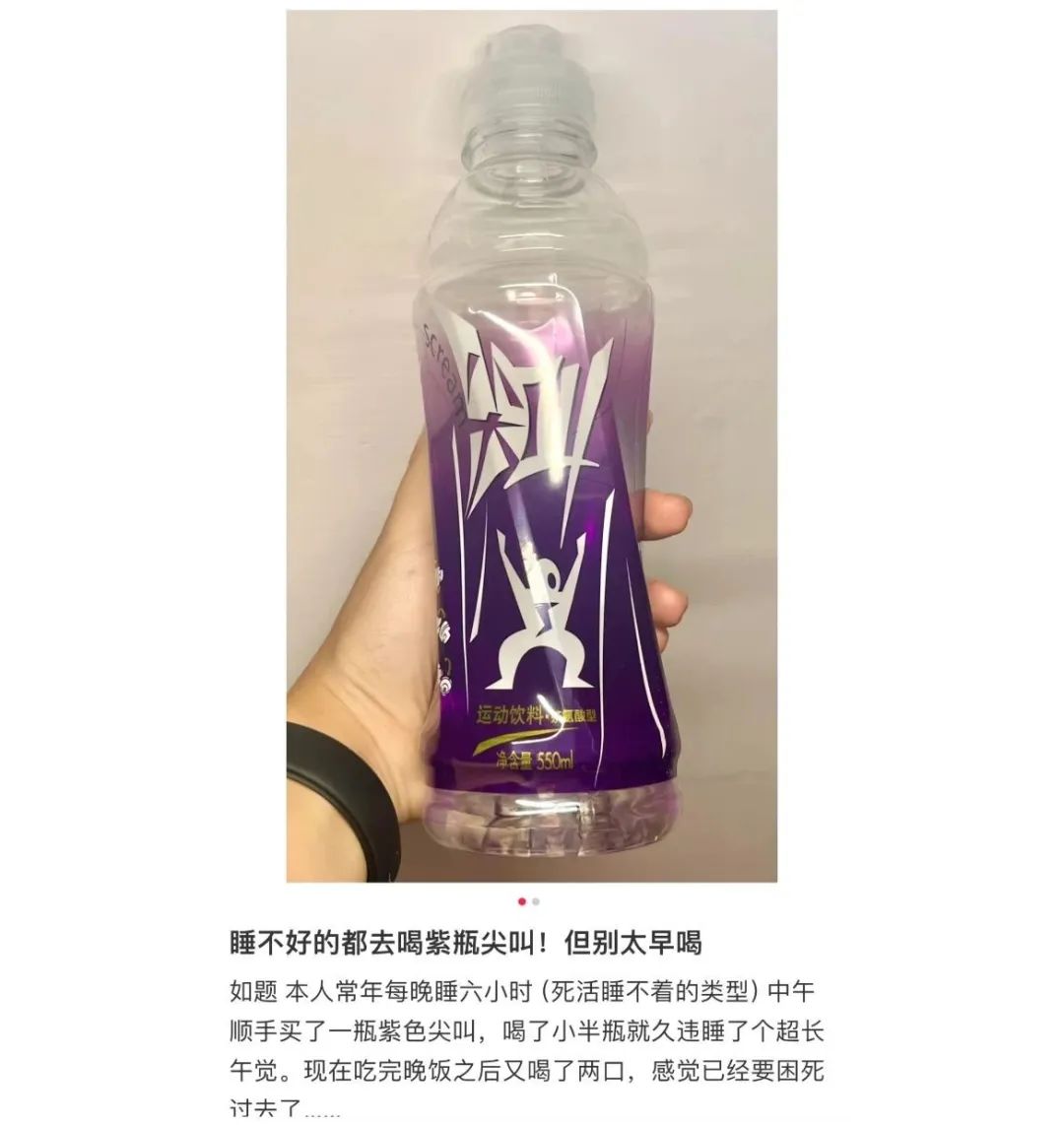 有网友发现,紫瓶尖叫里面加了茶叶茶氨酸,能帮助放松神经,让人更容易进入梦乡,掀起测评热潮。