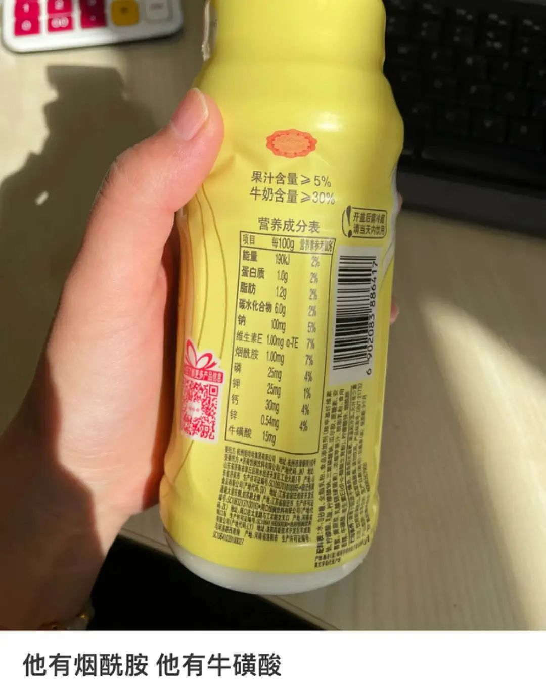 网友惊喜发现,营养快线里面真的有营养,除了常见的蛋白质和维生素,还有烟酰胺、牛磺酸,直接用保健品对标营养快线。
