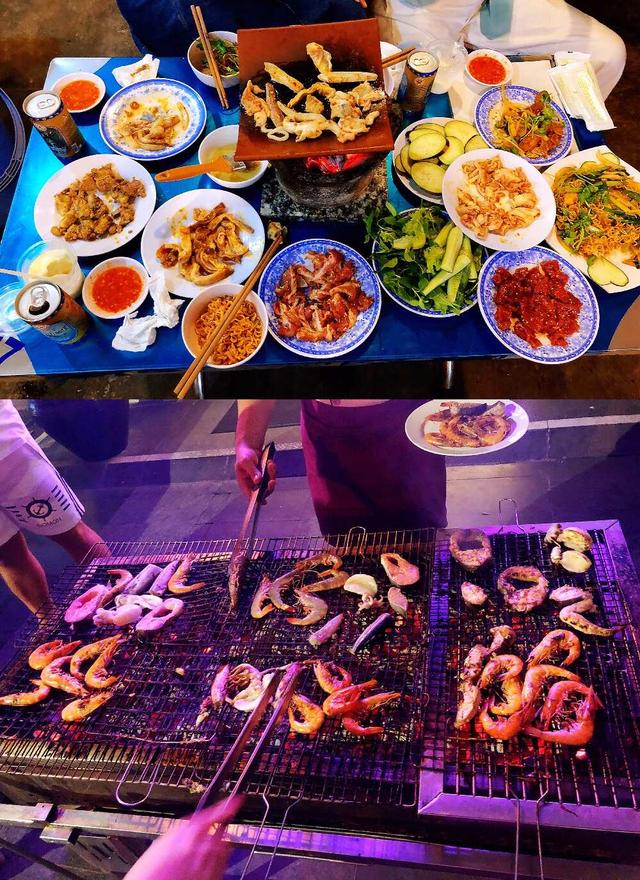 自己吃的瓦片烤肉和团餐里的海鲜自助