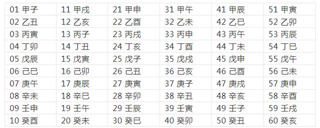 把“天干”中的一个字摆在前面,后面配上“地支”中的一个字,这样就构成一对干支。如果“天干”以“甲”字开始,“地支”以“子”字开始顺序组合,就可以得到:
