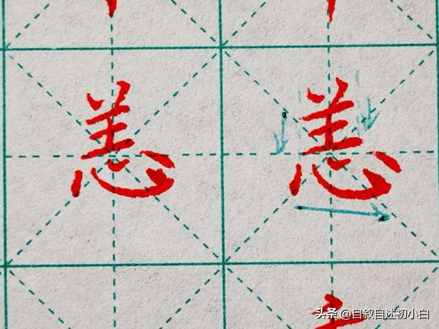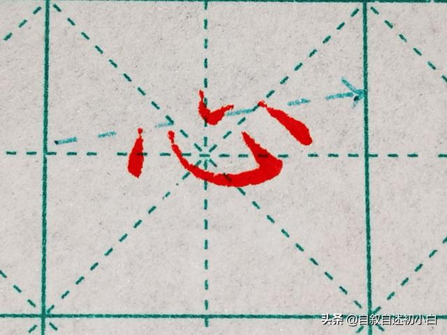 “心”字这类独体字是初学者必学的,初学者楷书学习要从独体字开始来学习,比如还有川、立等;这些字有个特点就是笔画独立互不交联,“心”这个字书写三个点画都在同一条斜向抗肩线上。