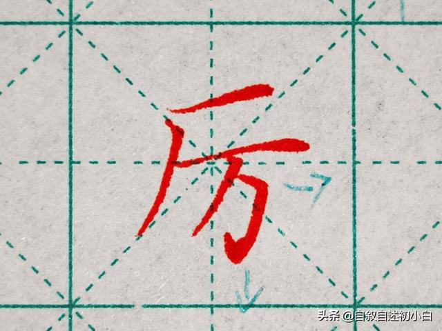 半包围结构“厉”字,厂字头的横画不要过长,被包围结构的“万”字是字体的最右点,也是字体的的最低点