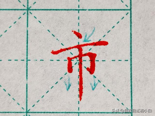 “市”字也属于交叉笔画字体,点横保留间距,下部的“巾”字短竖和竖钩书写竖直,不要内收书写