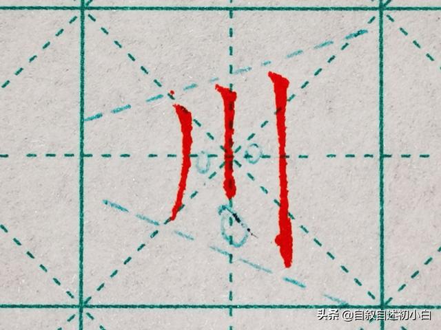 “川”字,竖向笔画起笔斜向对齐书写,笔画间距相等,中间竖画收笔位置最高,最后的长竖用垂露竖来结尾!