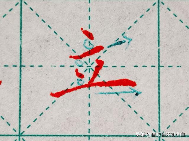 “立”字,也属于笔画独立字体,点横之间保留间距,两个横画之间点画居中书写,撇点收笔落在长横之上