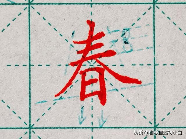 天覆结构,春字头横画书写不可过长,撇捺舒展左低右高,日字底矮小稳健,切记撇捺长度要适中,以防出现“衣服大,腿短”