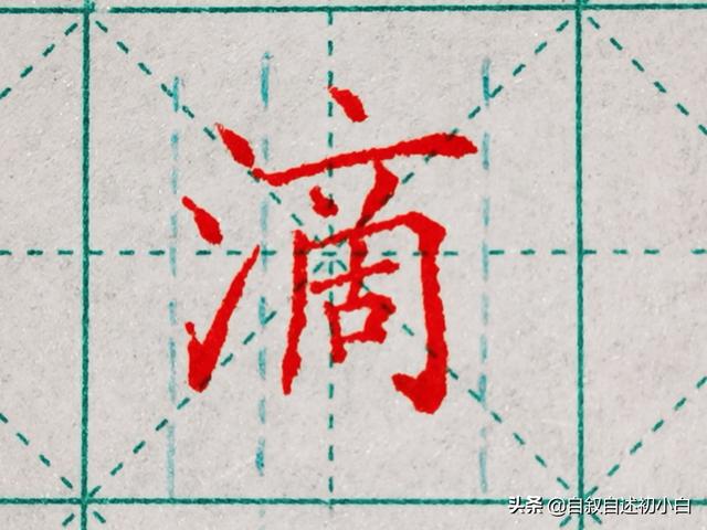 左窄右宽结构“滴”字,一般左窄右宽结构,窄的一侧一般是偏旁,大局把握准我么看细节,三点水第一个点右下方是横画的起笔位置,第二个点画对齐右侧相向点,横画长于下侧同字框。