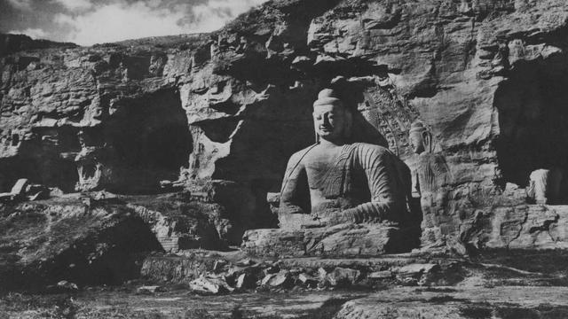 这是昙曜五窟全景,取自水野清一、长广敏雄1938年到1945年期间在云冈石窟的调查报告,这个报告在1952年由京都大学人文科学研究所出版为《云冈石窟》。云冈石窟1961年被国务院公布为全国首批重点文物保护单位,2001年12月14日被联合国教科文组织列入世界遗产名录。现在的石窟前,种有树木,所以拍不到这样的全景图片了。