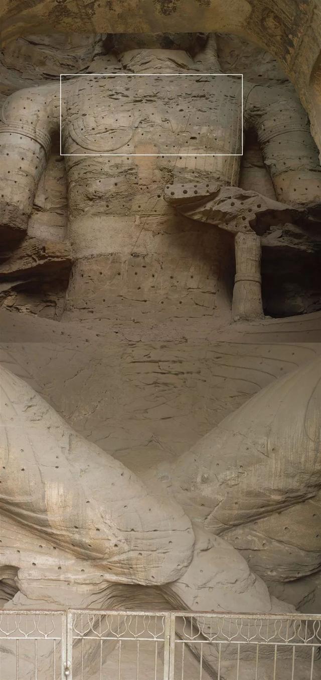 第17窟。主尊是交脚转轮王像。当时在位的文成帝拓跋濬。北魏从文成帝拓跋濬正式开始佛教的政教合一的制度,也正是这个开始,才有了昙曜监制开凿云冈五窟。另外提醒注意的是,交脚转轮王坐像的胸前,有两个龙头昂起(上图框内),这是《悲华经》告诉我们的转轮王诸宝的龙头缨的北魏形式,明确的王权象征。