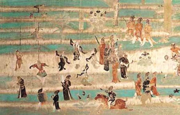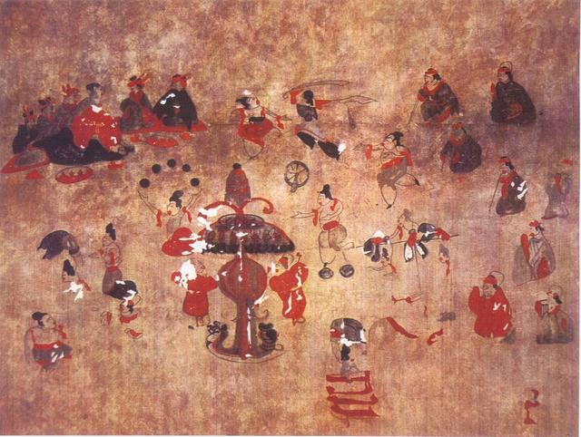 然后就是“上竿、跳索、倒立、折腰、弄碗、踢瓶、筋斗”等所谓“百戏”(今谓之杂技)的表演。男、女艺人都穿着红巾彩服,竞相表演,令人眼花缭乱。