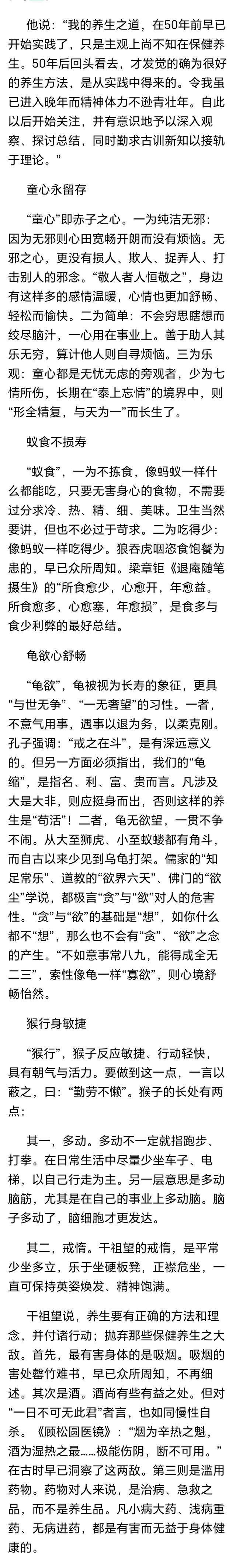 全国著名老中医千祖望教授,今年已100岁高龄。尽管他听力有所下降,只能依靠文字交流,身体活动也不如从前灵活,但他的头脑依然清晰,思维敏捷;视力良好,常读书看报、撰写文章并批改论文。他曾说:“上班至90岁,寿至100岁。”如今,这一目标已成现实,他甚至表示要活到110岁。如此高寿的秘诀,在于他坚持的“童心、蚁食、龟欲、猴行”八字养生法。
