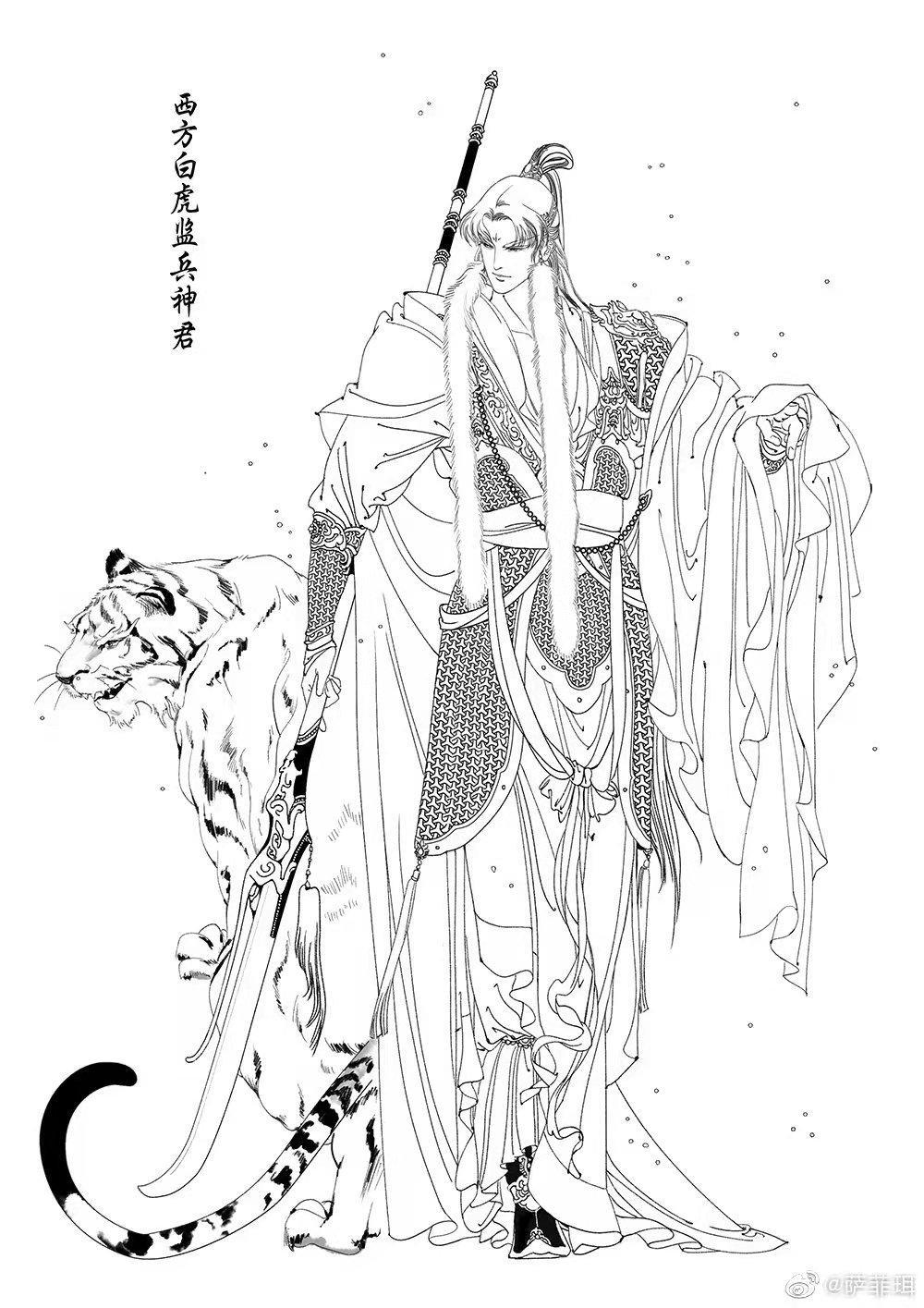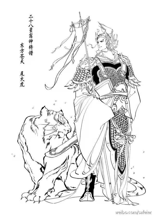 同时白虎也是战神、杀伐之神。白虎具有避邪、禳灾、祈丰及惩恶的扬善、发财致富、喜结良缘等多种神力。而它是四灵之一,当然也是由星宿变成的。是由二十八星宿之中,位西方七宿:奎、娄、胃、昂、毕、觜、参。所以是西方的代表,而它的白,是因是西方,西方在五行中属金,色是白的。所以它叫白虎不是因它是白色,而是从五行中说的了。