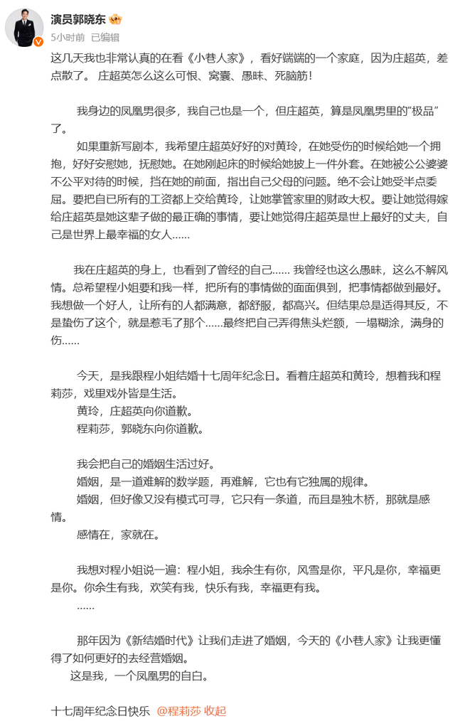 “ 今天,是我跟程小姐结婚十七周年纪念日。看着庄超英和黄玲,想着我和程莉莎,戏里戏外皆是生活。黄玲,庄超英向你道歉。程莉莎,郭晓东向你道歉。我会把自己的婚姻生活过好。”